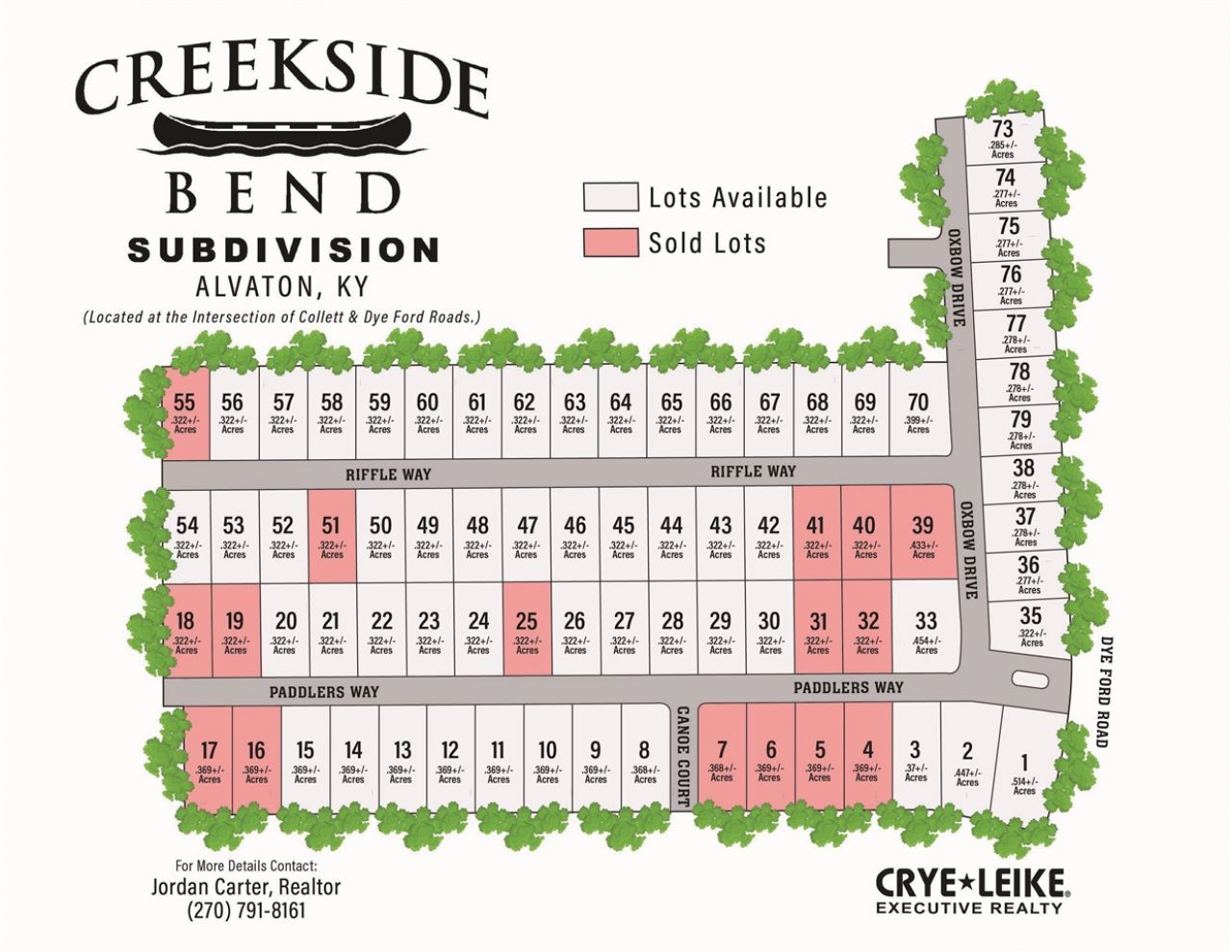 Welcome to Creekside Bend â?? Warren Countyâ??s Newest Development! Perfectly positioned at the intersection of Dye Ford and Collett Roads, Creekside Bend offers the best of both worldsâ??convenience to town with the peace of a country setting. Phase 1 is now available, giving you the opportunity to build your dream home in this thoughtfully planned community. Choose your lot and your builder! Neighborhood amenities include sidewalks, streetlights, sewer, natural gas, and high-speed internet. Several lots are ideal for basements, and each home will require a minimum of 2,100 sq. ft. of living space. Currently zoned for the highly sought-after South Warren Schools, Creekside Bend offers lot sizes ranging from .277 to .514 acres. Special pricing incentives are available for buyers purchasing 3 or more lots. Start your next chapter at Creekside Bendâ??where community, convenience, and comfort come together.