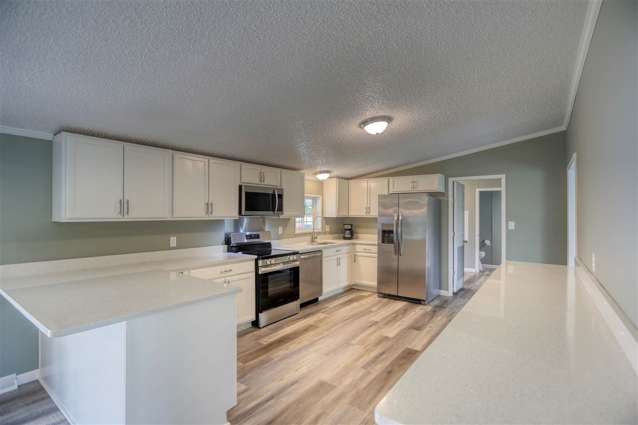 Updated 4-bedroom manufactured home on a permanent foundation. Updates include a new metal roof, new HVAC, new water heater, new siding, all new windows, all new flooring including LVP, new paint throughout, new stainless steel kitchen appliances, new cabinets, new quartz countertops, new covered front and back decks, new gutters, new bathroom vanities, new toilets, new wood-burning fireplace insert, new front and back exterior doors, and all new lighting fixtures. Back entrance from 41' covered deck into laundry/mud room with half-bath. High-speed fiber optic internet. Zone 3 insulation package with 2x6 exterior walls for improved energy efficiency. Convenient to Westmoreland and Scottsville.